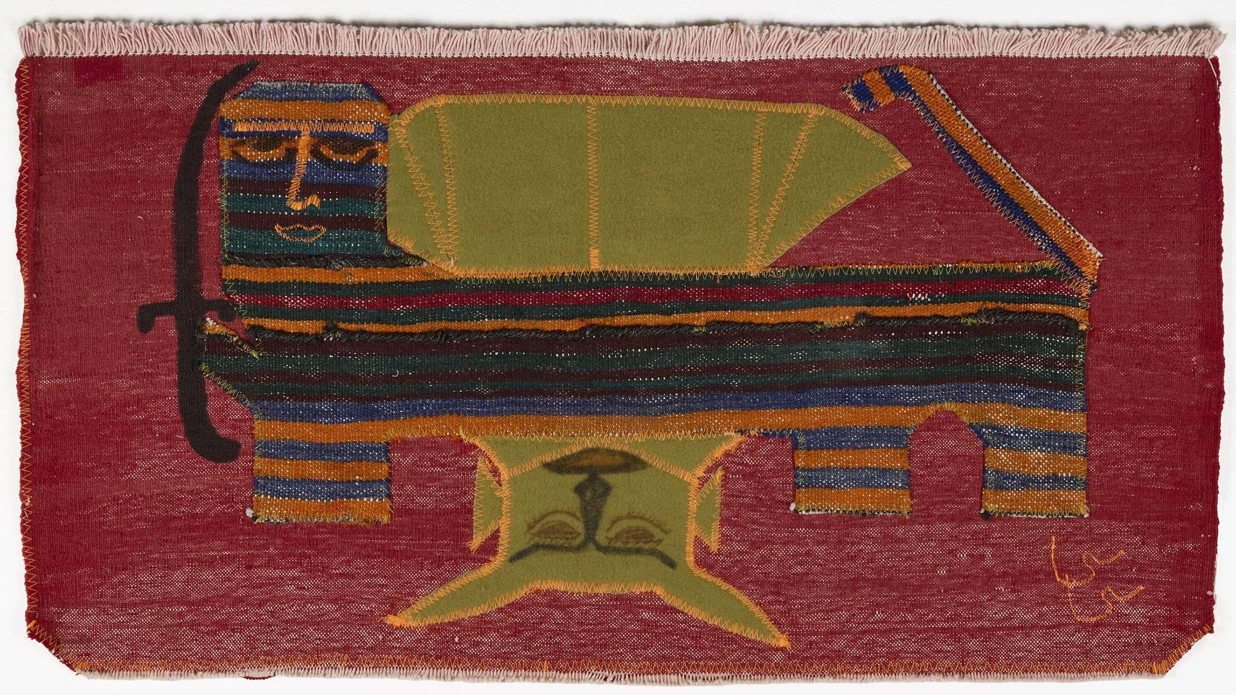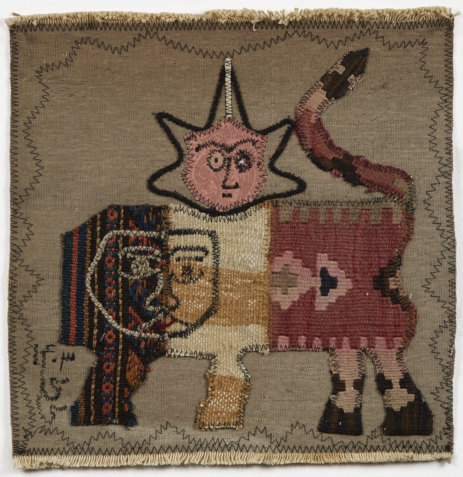 He bought a used sewing machine to repair old frayed and torn rugs. His first pieces were experiments with collaging and layering the weavings as he learned to master his machine. For subject matter he used the traditional Persian iconography of the Lion and the Sun, exploring its aesthetics and symbolism intertwined with ancient Persian history. His works are never decorative; they are rough and wild and have the feeling of drawings. He never lost respect for the process of the weaving itself, expressionistically mixing patterns pre-existing patterns and subtle colors, creating a new medium.