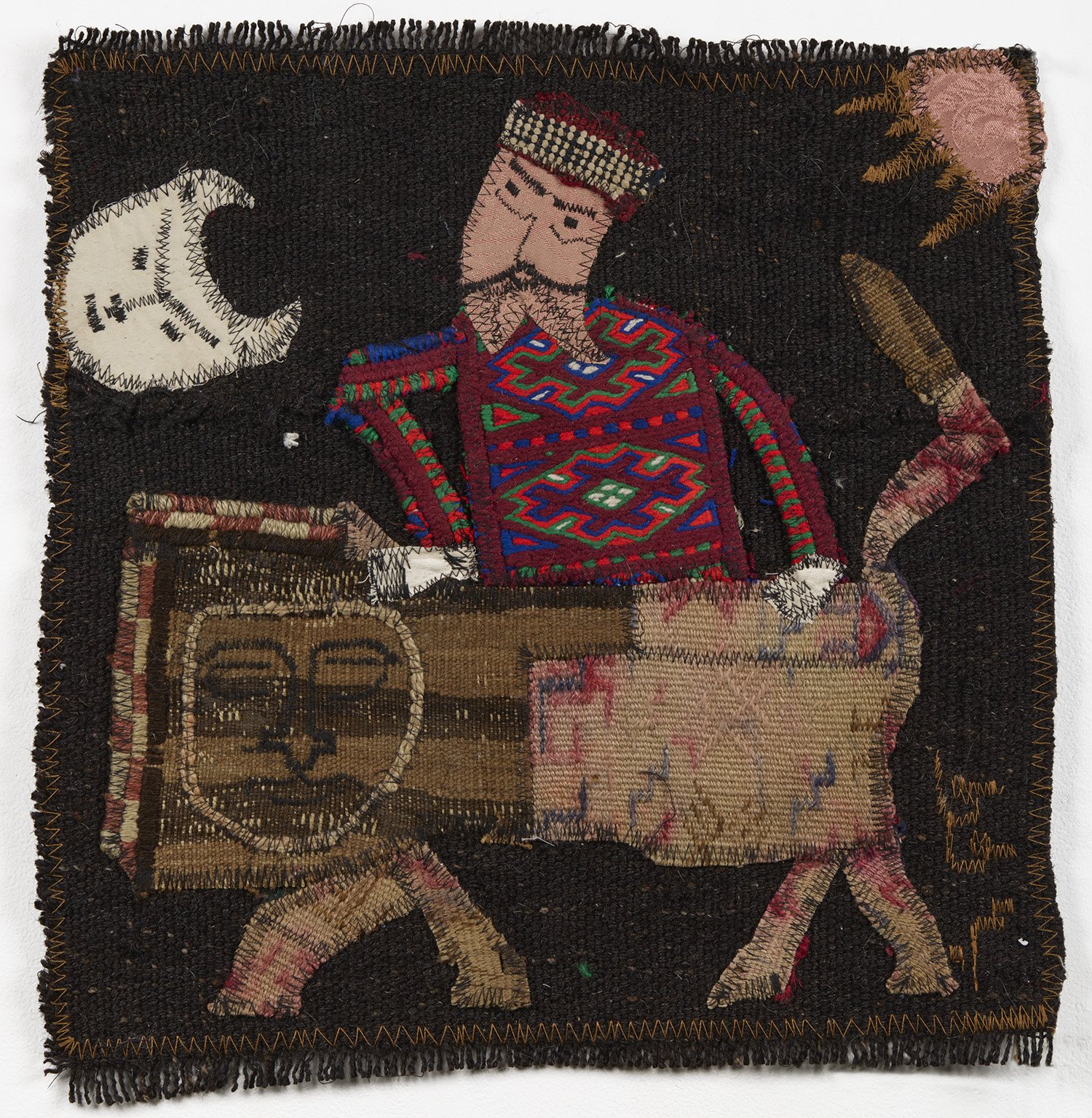 CC is the nickname of the artist Alireza Asbahi who was born in 1969 Tehran, into a large family. He attended school until the fifth grade, when his father died leaving him the responsibility of providing for the family. He found work in a in a clothing manufacturing company. His father had been a tailor, so textiles were in his blood. He collected kilims and crafts and sold them in the Jomeh Bazaar. In 1969, due to politics, the bazaar was closed, depriving him of his livelihood.
