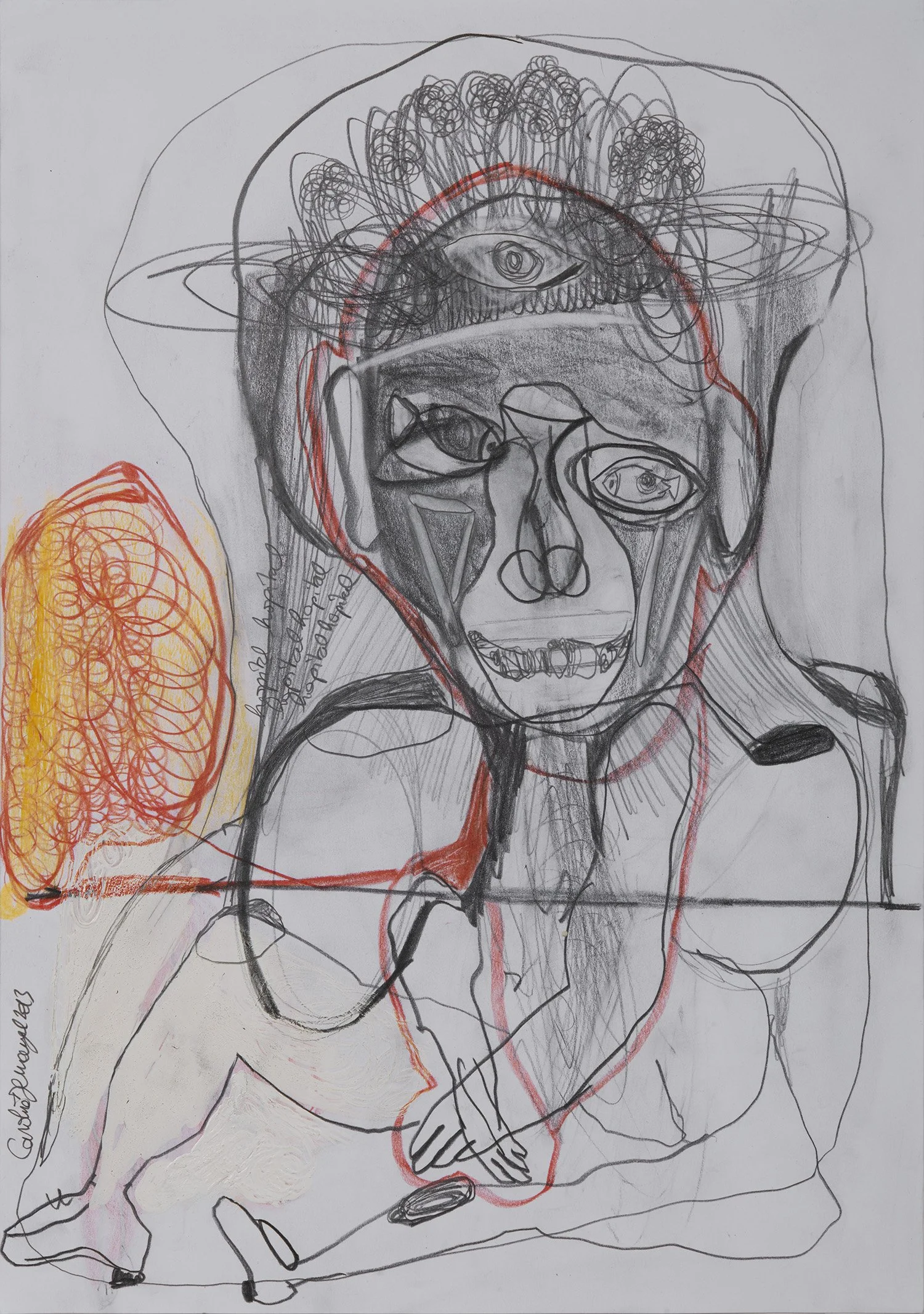 There is the urgency and necessity of pictorial language, a sort of ribambelle (multitude) of signs, knots, guts, nuclei (the inside of the body is very present) and ….sometimes words come to me that stand between the sheet and me, asking me to inscribe them.