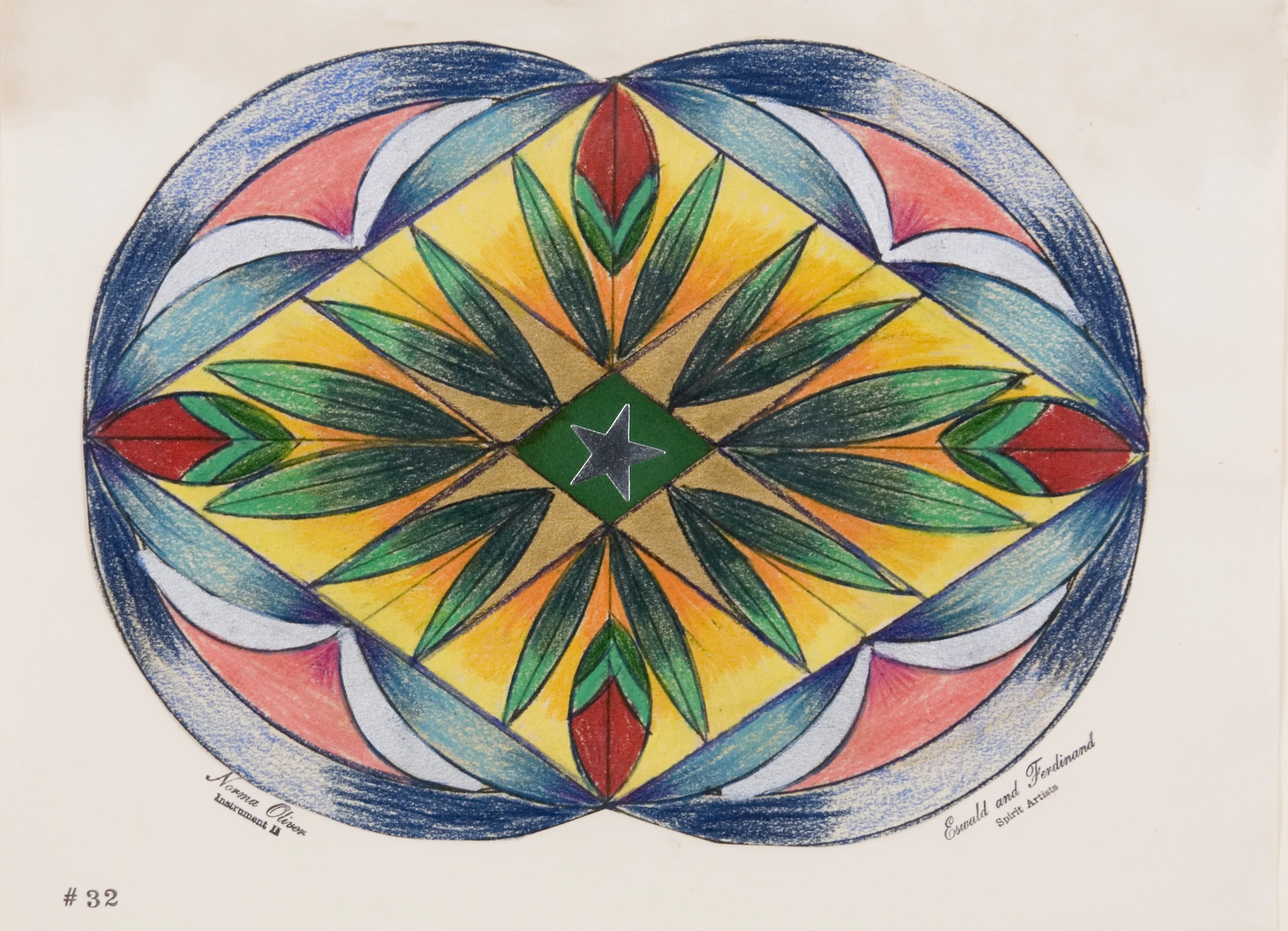 Helen Wells was called Instrument 1 by Eswald, her spirit guide, and her adopted daughter, Norma Oliver, was called Instrument 2. Between them they channeled a broad array of historical luminaries including Bishop Cornelius Jensen, Ralph Waldo Emerson, Henry David Thoreau, Andrew Jackson, Thomas Jefferson, Tom Paine, Abraham Lincoln, Pythagoras and his group including Socrates and the Seven, Tecumseh and Osceola. Well’s drawings seem to begin with a meandering line that then plunges into imagery, Norma Oliver made her own portraits of Jansen Society members by portraying them in color-specific mandalas.