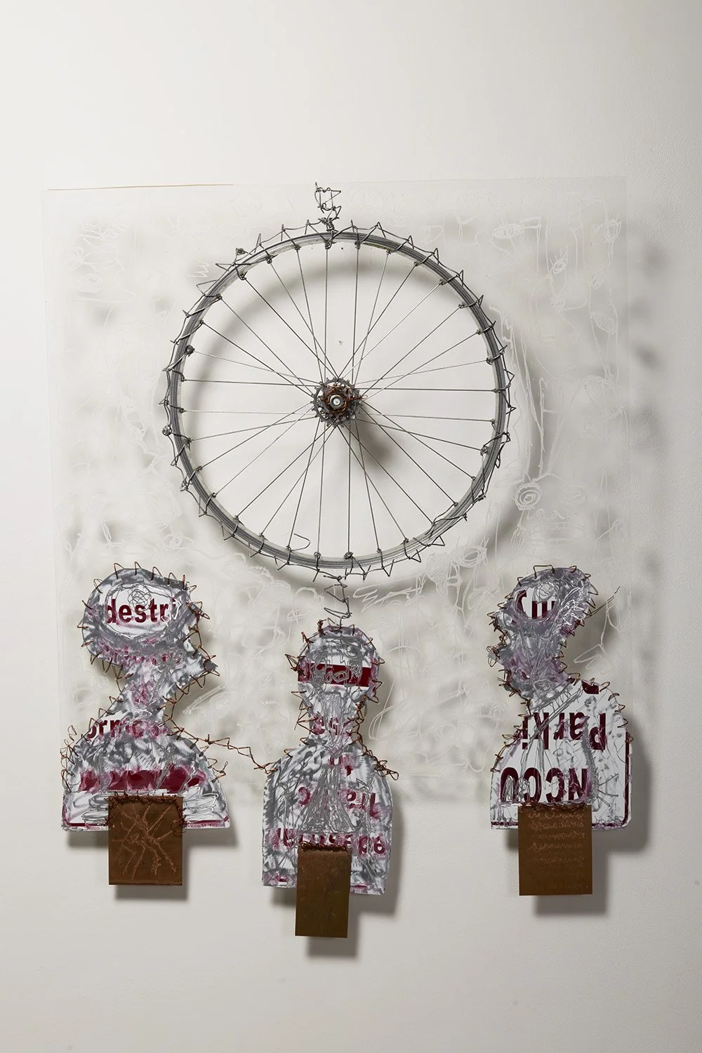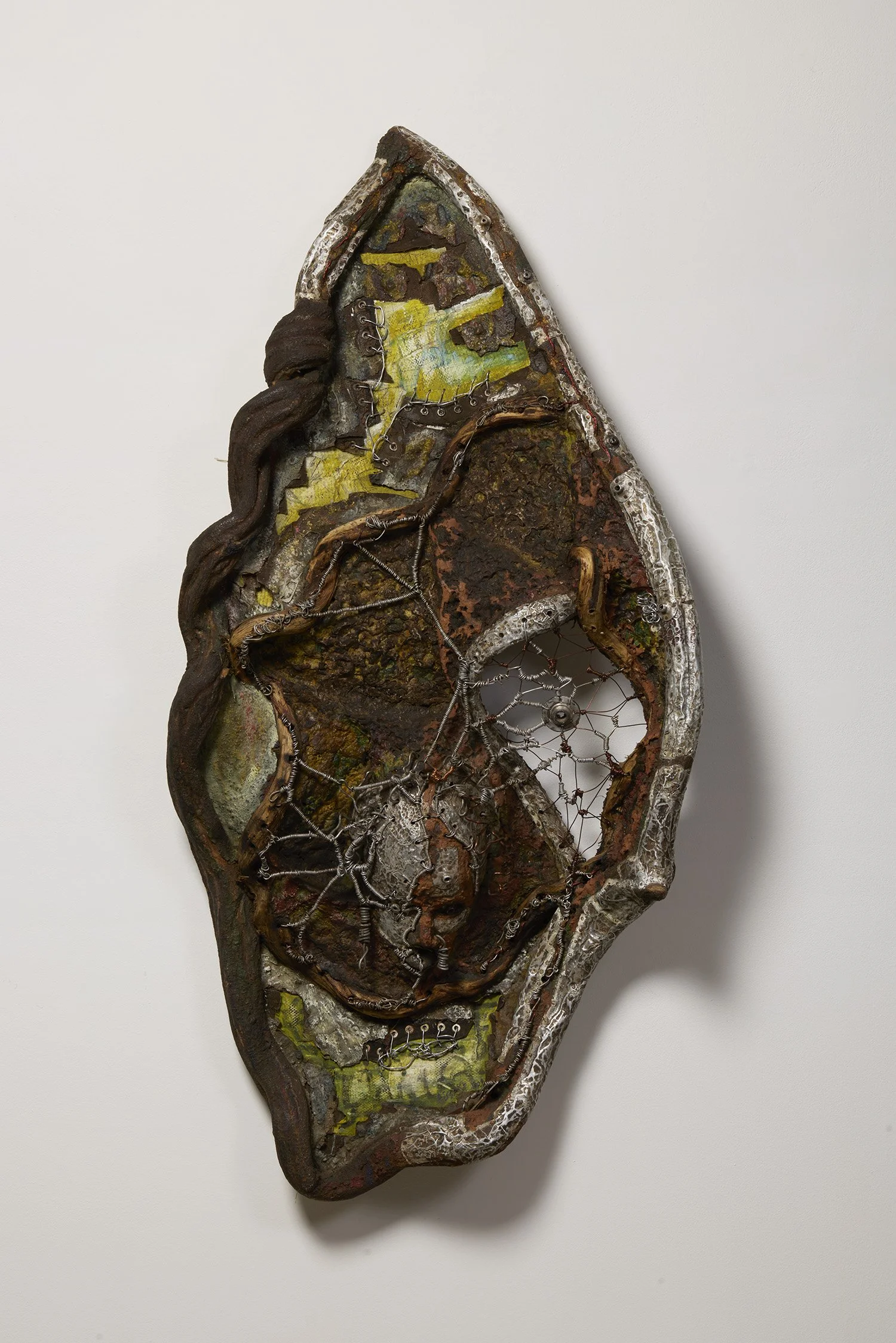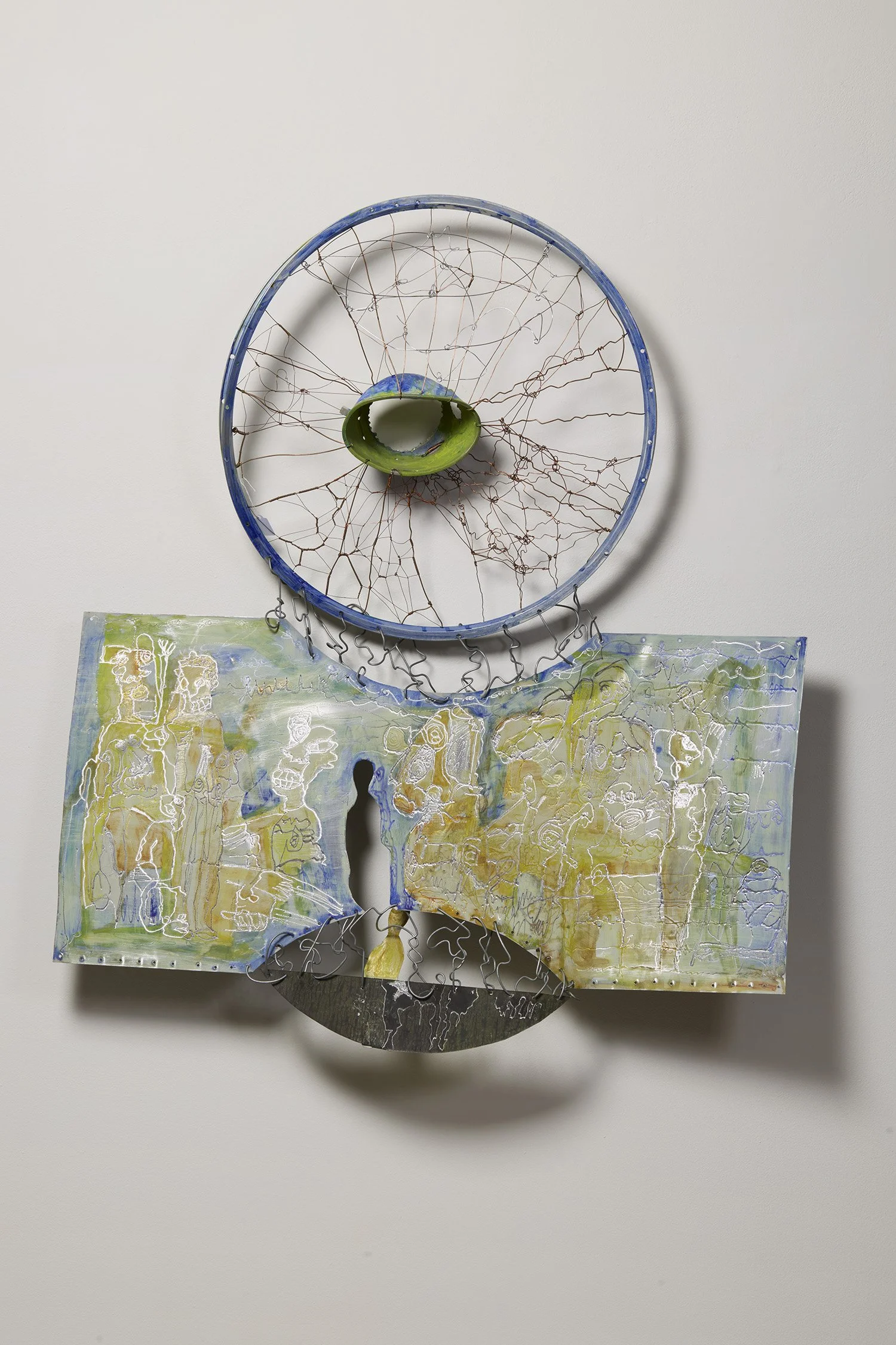 Cameroonian artist Jean Michel Dissake’s sculptural works use found and recycled materials to represent a balance between nature and technology by weaving natural objects such as wood, vines, termite dust, water hyacinths, and palm fronds together with computer boards, aluminum wire, license plates, and car parts. Informed by his cultural heritage as well as wisdom gained from living for nine years in the forest on the Mungo River, Dissake’s work invokes a dialogue on ecological and spiritual matters and speaks to timely issues of unity, peace, love, and oneness with nature.
