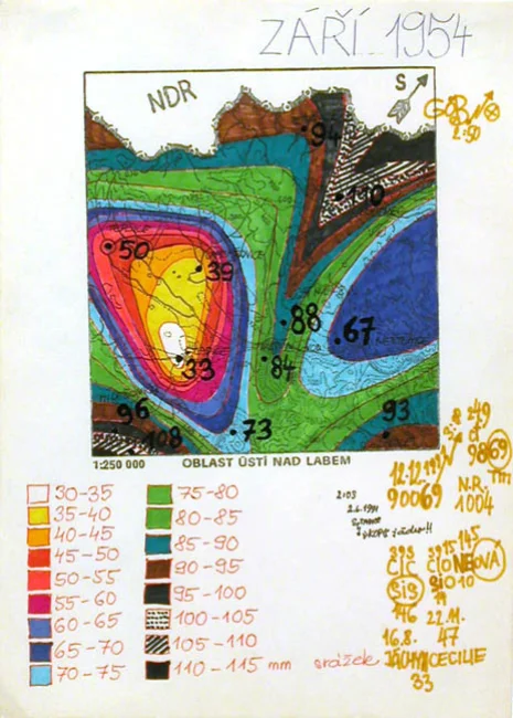 In the case of Zdenek Kosek, this is nothing more than the immediate moment of temporal existence and all things in this ever-present moment happen simultaneously, which he, in his own mindset, feels he is causing. The charts are documenting his tremendous affect upon the world. He specifically believes he can control the weather of the world and influence personal and political events.