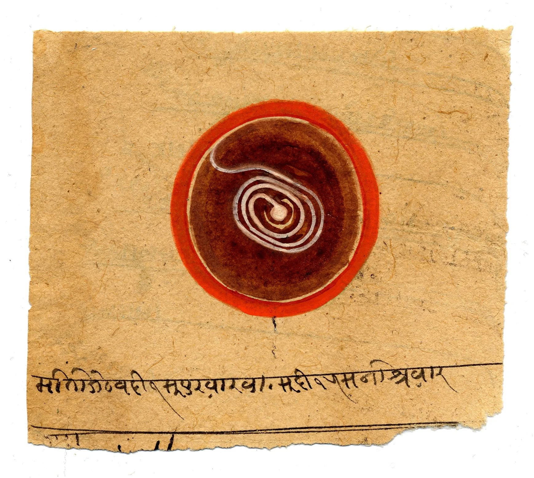 These anonymous small paintings come from a tradition in Tantric Hinduism, which began in the fifth or sixth century C.E. After painting one, a devotee is to meditate on an image to manifest the divinity. It is a practice that involves a separation from one’s ego. In Sanskrit tantra means “loom” or “weave,” but also “treatise.” The hand-written Tantra treatises date back at least to the seventeenth century, as do the paintings. The Tantra treatises and paintings have been copied over many generations. The accompanying symbolic paintings evolved with the treatises. Now many of them have been separated from the original treatises.