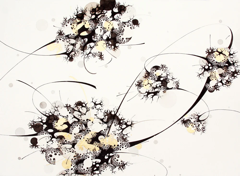 Similarly Hyungsub Shin’s work uses artificiality to find the place where nature and culture coincide. His abstracted sculptures and drawings of rhizomes define life in continual flux, expansion by division and fragmentation, and identity within social relationships. Using jute rope, he branches them repeatedly into smaller scale constructs. The result is an evocative sculpture composed of intricate nodes of branches, that depict biological unity. His meticulously rendered works on paper concentrate on brachial forms in walnut ink, gold leaf and watercolor, that are freely drawn and using repeated overlays of stencil.